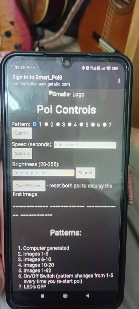 Click on the “Sign in to a WiFi Network” button (it shows in notifications dropdown). You will go to the Captive Portal screen (webpage hosted on ESP8266) where you can do some limited poi controls like change pattern: