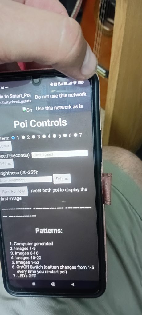 Connect to your SmartPoi AP (default name Smart_Poi7, with default password, “SmartOne”). Open the Android app (latest version from https://smartpoifirmware.circusscientist.com) and try to change pattern – nothing works. Cannot upload, fetch settings etc! No error messages either!